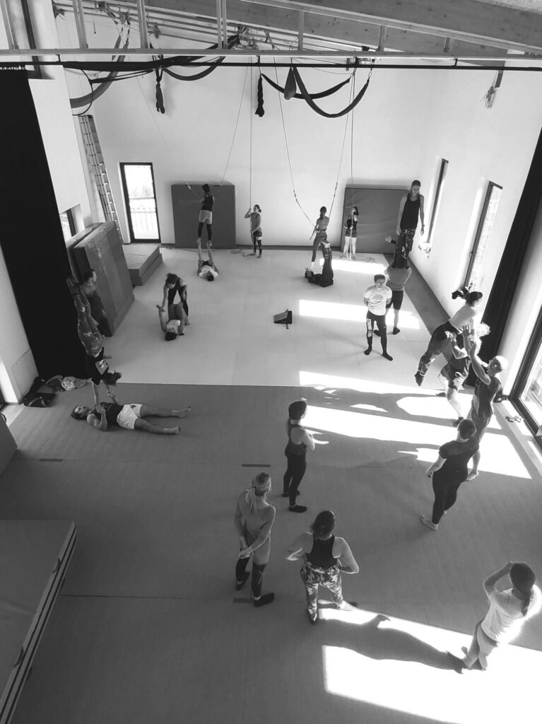Klassisches Treffen von Akrobat*innen im Akrosphäre-Zirkuszentrum. Wir kommen zusammen, um ein Wochenende lang gemeinsam zu trainieren, abzuhängen und uns auszutauschen.